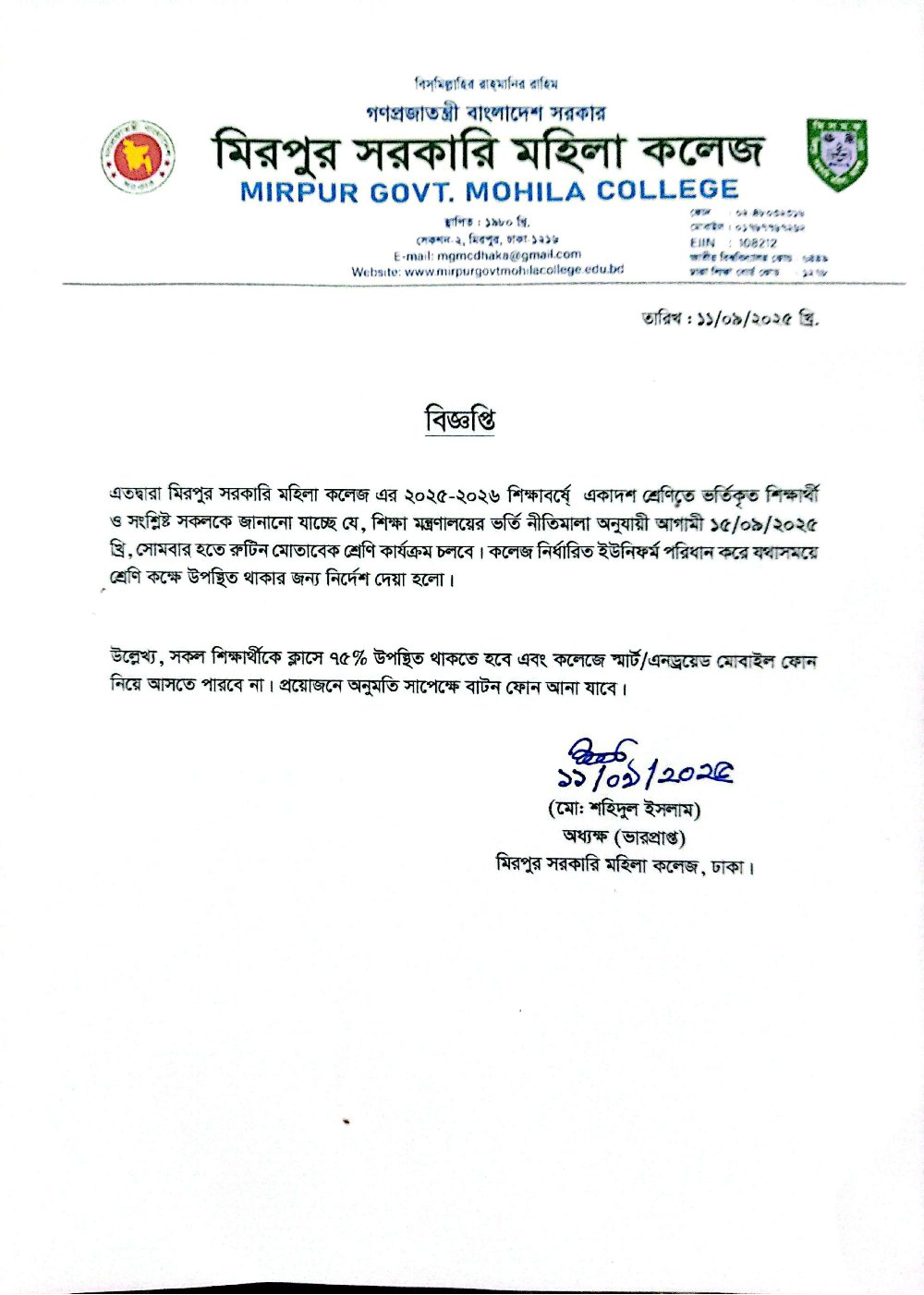 ২০২৫-২০২৬ শিক্ষাবর্ষে একাদশ শ্রেণিতে ভর্তিকৃত ছাত্রীদের ক্লাস সংক্রান্ত বিজ্ঞপ্তি